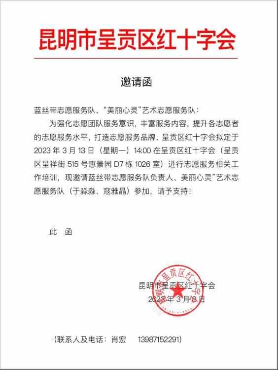 2023年3月13日, suncitygroup太阳成集团“美丽心灵”团队的于淼淼、赵羚彤两位同学参加呈贡区红十字会表彰会暨呈贡区红十字会志愿服务项目工作培训会。会议由云南省红十字会刘昱君老师主持。本次培训的主题“志愿服务项目”的相关内容, suncitygroup太阳成集团“美丽心灵”团队在过去的两年里积极参与红十字会志愿服务工作得到呈贡区红十字会以及社会的认可和表彰,在本次培训中,呈贡区红十字会对“美丽心灵”团队寄予更高的期望。