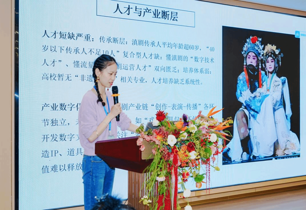 王钧玉同学以《新质生产力赋能滇剧在当代数字媒介中的转化研究》做专题发言。王钧玉对新质生产力赋能滇剧数字化转型面临的挑战进行分析,认为当前的滇剧要进行数字化转型主要面临着技术上的困境与资金问题,以及人才与产业上的断层这两大危机。在此基础上,她认为要实现滇剧在当代数字媒介中的转化可以从以下几方面进行:一是提升数字化转化效能,合理运用前沿技术;二是构建专业的人才队伍;三是强化滇剧等艺术的传播与教育。王钧玉在发言过程中谈到了当前的滇剧研究可以有新的技术上的突破来为其赋能,但仍然需要扎实的田野调查来支撑,技术上的创新还处于一个理想比较丰满的状态,实际田野中还需要更多的数据来完善。