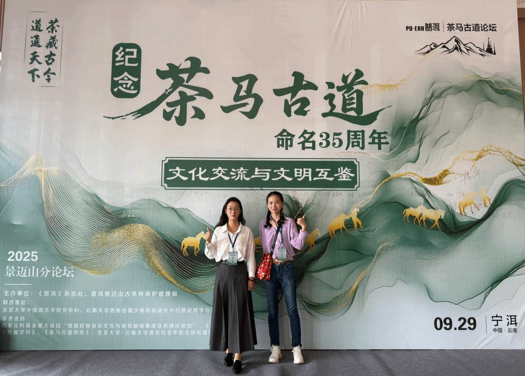 2025年9月29-30日,公司2024级艺术理论、民族艺术与非物质文化遗产方向研究生李丽莹、王钧玉应邀参加了由北京大学中国语言学研究中心、云南大学西南边疆少数民族研究中心暨民族学与社会学公司、《普洱》杂志社、普洱景迈山古茶林保护管理局联合主办的主题为“文化交流与文明互鉴:纪念茶马古道命名35周年”学术研讨会,并围绕茶马古道相关主题进行汇报发言。