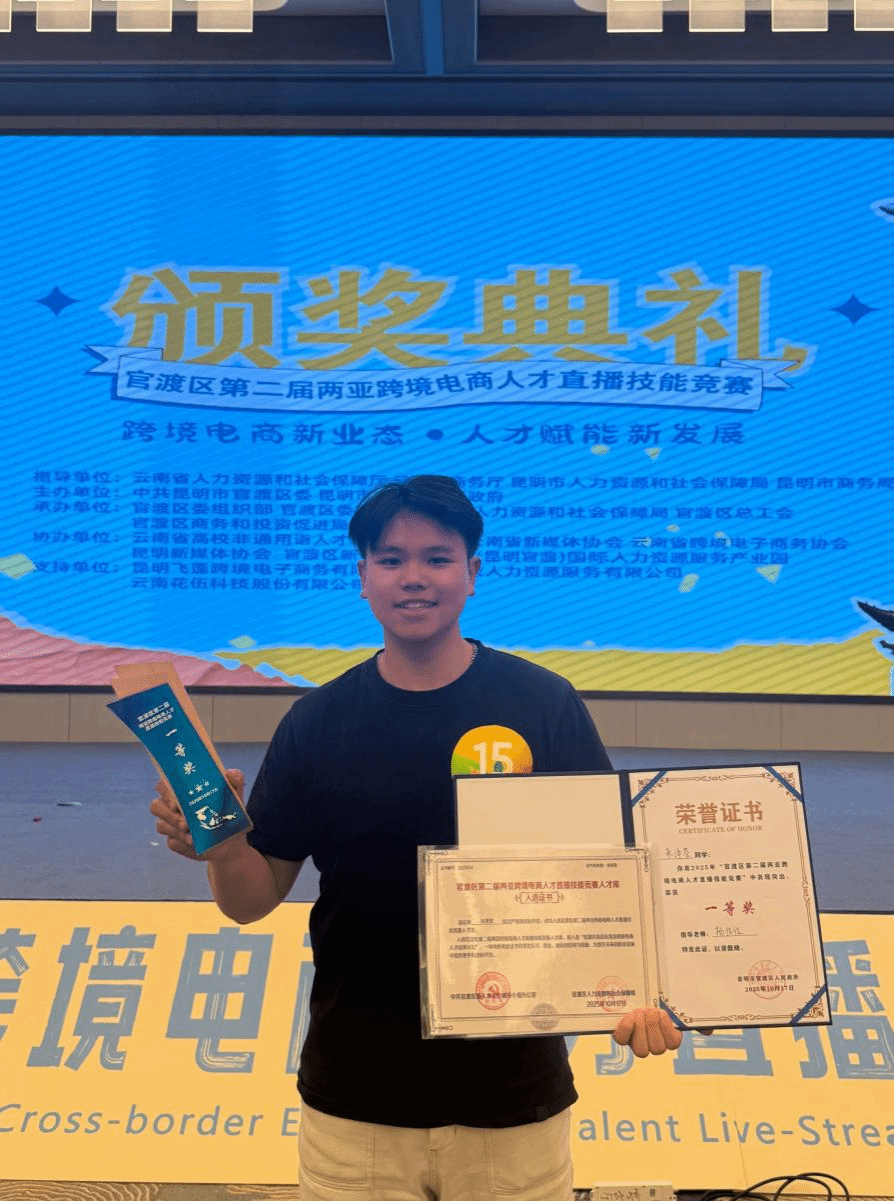 2026届毕业生朱泽荃荣获第一名,招生与就业处获优秀组织奖。赛后,朱泽荃将与其他优秀选手一起入选官渡区南亚东南亚跨境电商人才库,获得持续的职业发展支持。