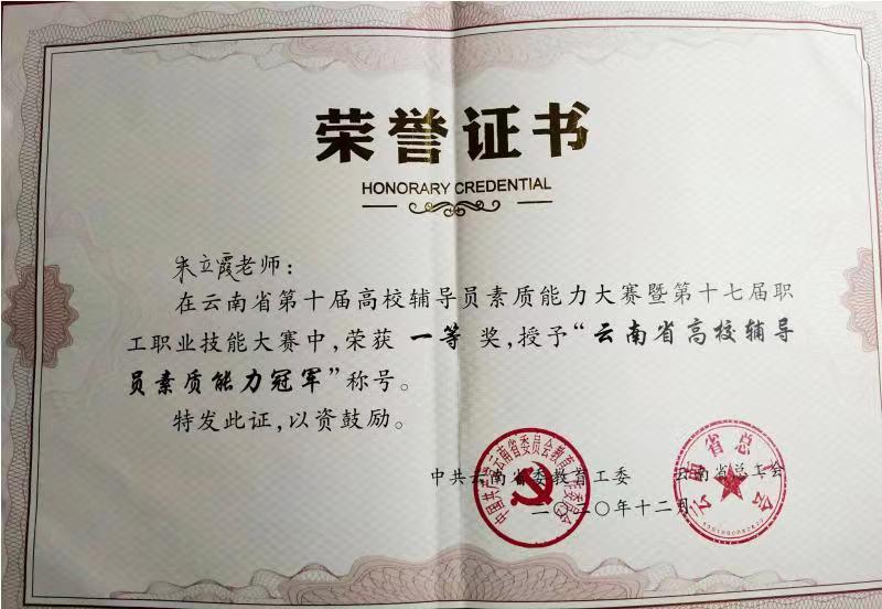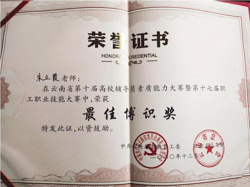 第十届云南省辅导员素质能力大赛于2020年12月3日至4日在西南林业大学顺利举办。suncitygroup太阳成集团辅导员朱立霞老师以云南省总决赛第一名的成绩荣获大赛“一等奖”和“最佳博识奖”,并荣获由省委教育工委和省总工会授予的“云南省高校辅导员素质能力冠军”称号。