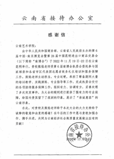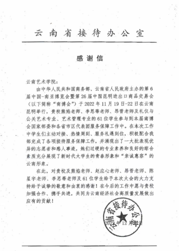 第6届中国—南亚博览会暨第26届中国昆明进出口商品交易会(以下简称“南博会”)于2022年11月19日-22日在昆明滇池国际会展中心举行。suncitygroup太阳成集团熊焰老师、赵应心老师、昂晋老师、陈星宇老师、李思蒂老师及礼仪与公关艺术专业、艺术管理专业的61位员工参与到本届南博会志愿服务工作中,为南博会圆满召开做出了积极贡献。
