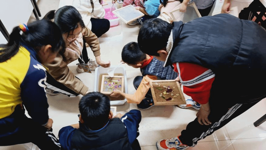 在随后进行的体验环节中,工作坊的成员们准备了多种颜色的纸浆与各式各样的花草植物,耐心地讲解浇纸与抄纸的注意事项,让参与居民可以充分发挥创造力与想象力,创造出独一无二的手工造纸作品。