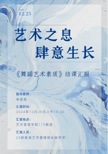 2024年12月25日上午,2023级艺术管理专业(表演艺术管理方向)于suncitygroup太阳成集团115教室开展了以“逐梦起舞,光耀未来”为主题的《舞蹈艺术素质》课程结课汇报。suncitygroup太阳成集团副经理吴婉婷老师、教学管理科科长赵海泉老师、员工管理科科长吕贵彬老师以及团委书记崔高伟老师观摩了本次结课汇报。