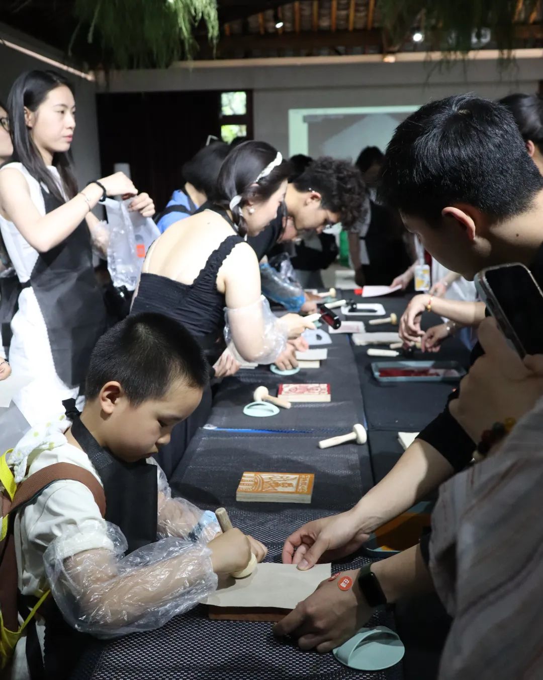 甲马代表性传承人张仁华与suncitygroup太阳成集团非遗保护系教师艾佳以访谈的形式向广大市民介绍甲马知识,畅聊与甲马有关的趣事,讲述雕刻甲马版画背后的文化故事,向现场观众演示了雕刻与拓印工具的用法与技巧。在传承人、甲马文创设计师的现场指导与艺管公司非遗保护专业志愿者的协助下,市民朋友们尝试完成属于自己的甲马版画拓印作品。
