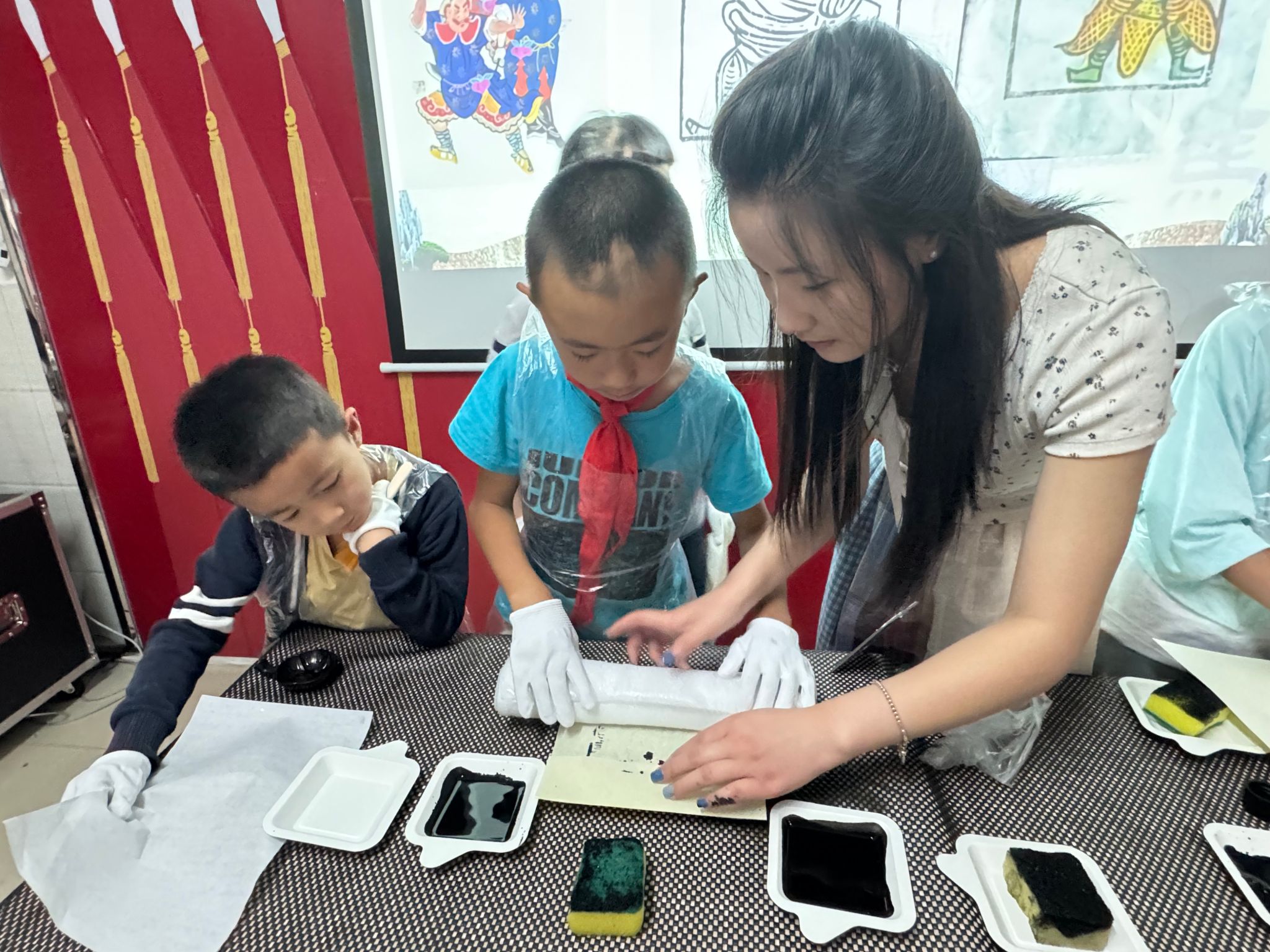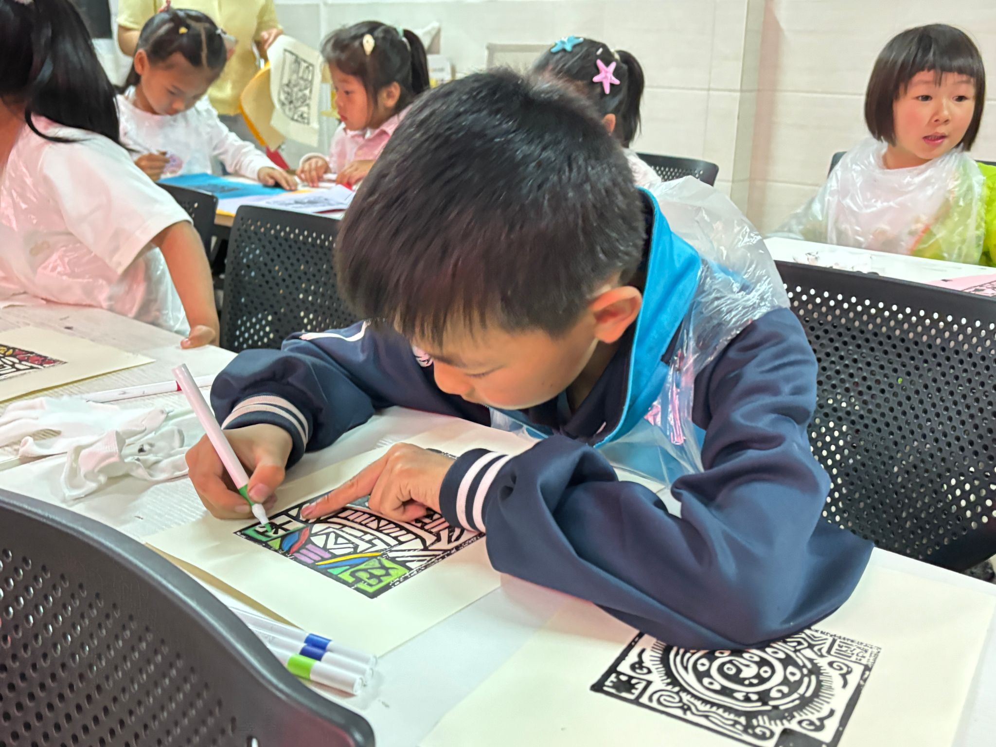 实践环节中,志愿者现场演示了拓印技巧:从墨汁调配到均匀上墨,再到用适宜的力度按压,每一步尽显传统技艺的细腻。孩子们戴上围裙和手套,化身 “小工匠”,在五颜六色的纸张上拓印雕版图案,并发挥想象力用彩笔为作品上色。传统的黑白拓印与孩子们的缤纷创意相互交融,让这门古老技艺在他们的手中焕发出新的生机与活力。