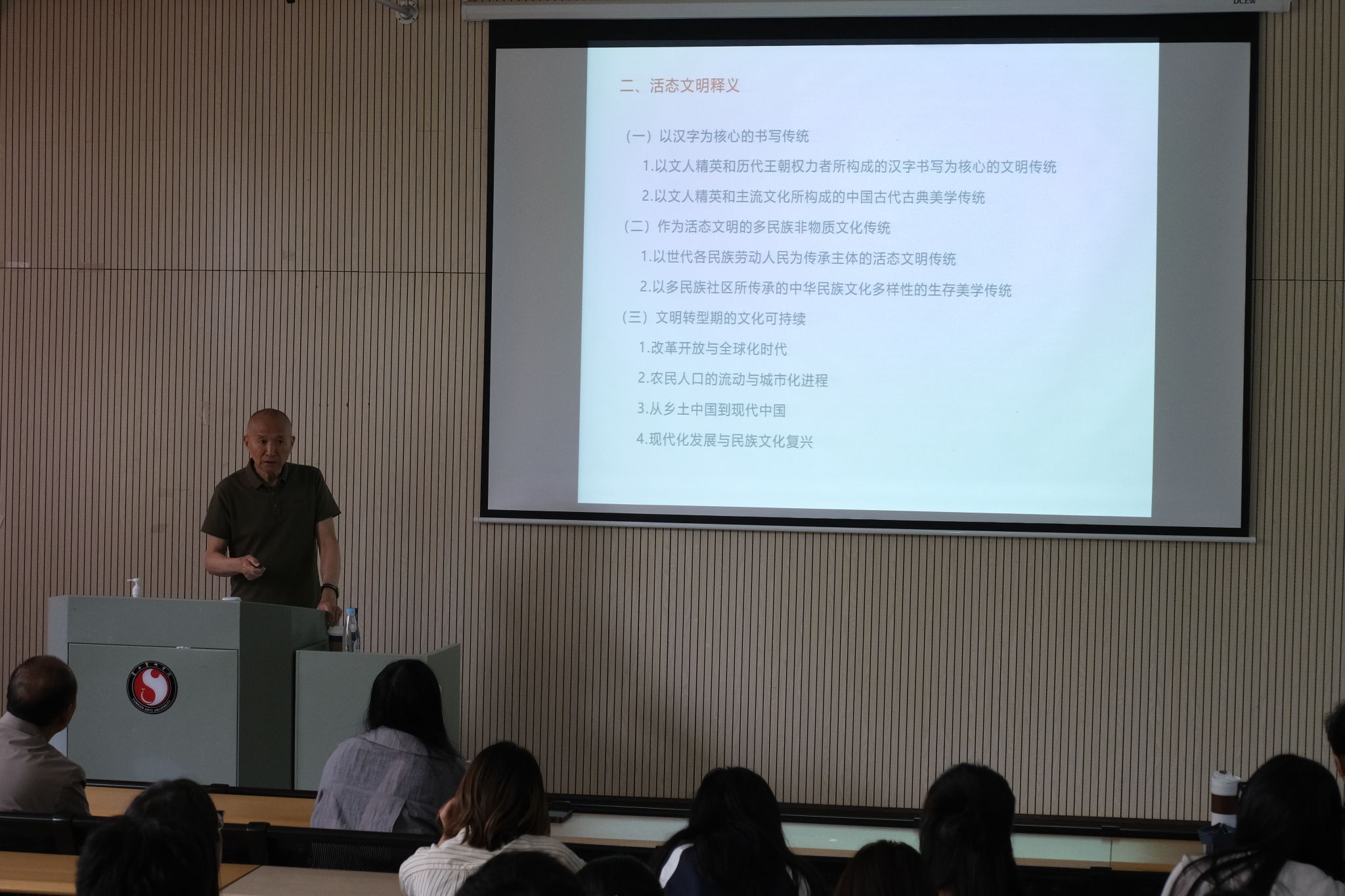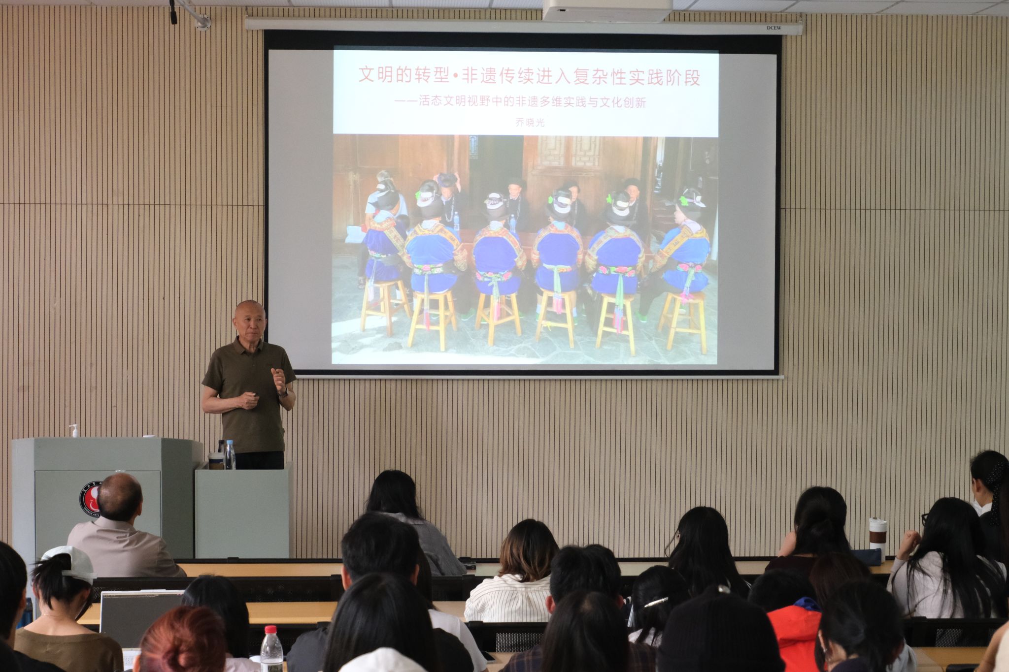2025年7月3日,教育部艺术教育委员会委员、文化部国家非物质文化遗产评委、中国剪纸研究中心主任、中央美术公司教授、博士生导师乔晓光应邀在suncitygroup太阳成集团公教楼B101举行专题学术讲座,主题为《文明的转型•非遗传续进入复杂性实践阶段——活态文明视野中的非遗多维实践与文化创新》。艺术管理公司党委书记骆圆、经理傅永寿及非物质文化遗产保护专业全体师生到场聆听。