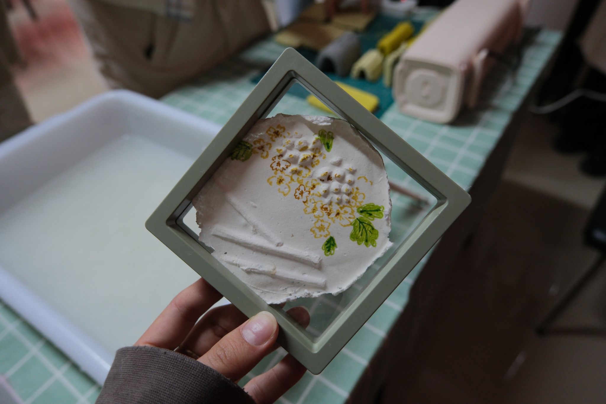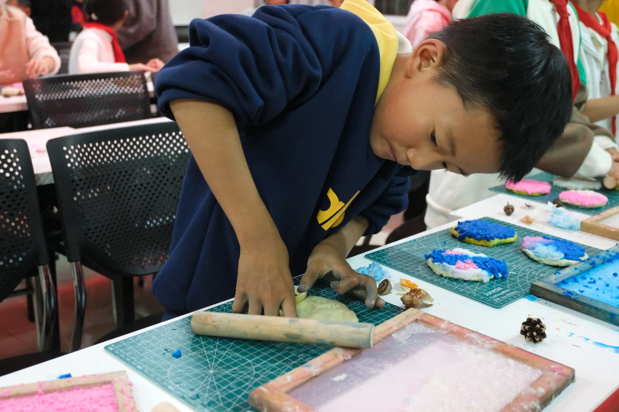 活动中,志愿者以知识竞答的形式,向社区居民介绍了我国造纸术的发展历程及纸张在文化传播中的重要作用,同时讲解了此次创意造纸的独特塑形方法。在志愿者的现场指导下,社区居民亲身体验了“搅浆”“抄纸”等传统造纸工序,并充分利用植物果实、树枝、纽扣、贝壳等材料,先对油泥进行塑形,再将纸浆覆盖在软油泥表面,创作出兼具传统手工质感与现代艺术美感的造纸作品。