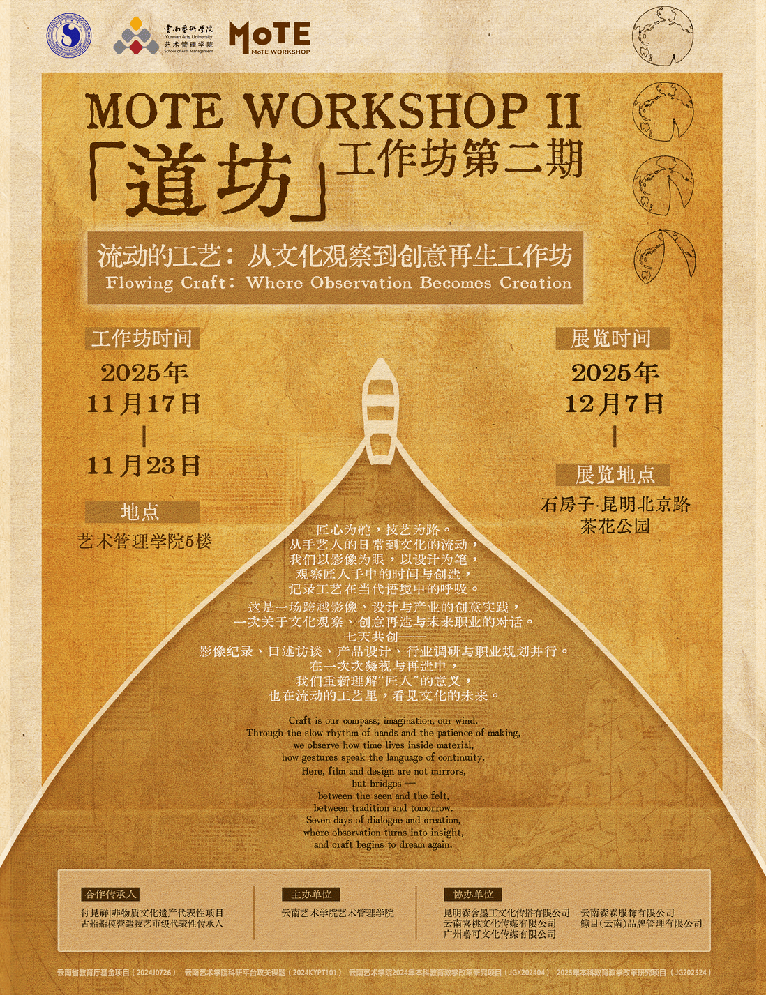 2025年11月17日上午,由suncitygroup太阳成集团非物质文化遗产保护专业主办的「道坊」工作坊第二期——“流动的工艺:从文化观察到创意再生”在suncitygroup太阳成集团504教室正式开班。开班仪式由非物质文化遗产保护专业系主任张磊主持,公司领导、合作导师、课程团队及25名入选学员共同出席。