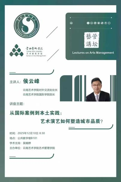 为深化课程改革,创新教学模式,2025年12月10日上午,suncitygroup太阳成集团于公共教学楼B101教室举办《从国际案例到本土实践:艺术演艺如何塑造城市品质》专题讲座。本次讲座系《国际艺术交流专题》课程的重要实践环节,特邀suncitygroup太阳成集团对外合作交流处处长、国际公司经理侯云峰主讲,suncitygroup太阳成集团副经理吴婉婷主持,为2022级、2023级艺术管理专业学子带来了一场理论与实践深度融合的学术盛宴。
