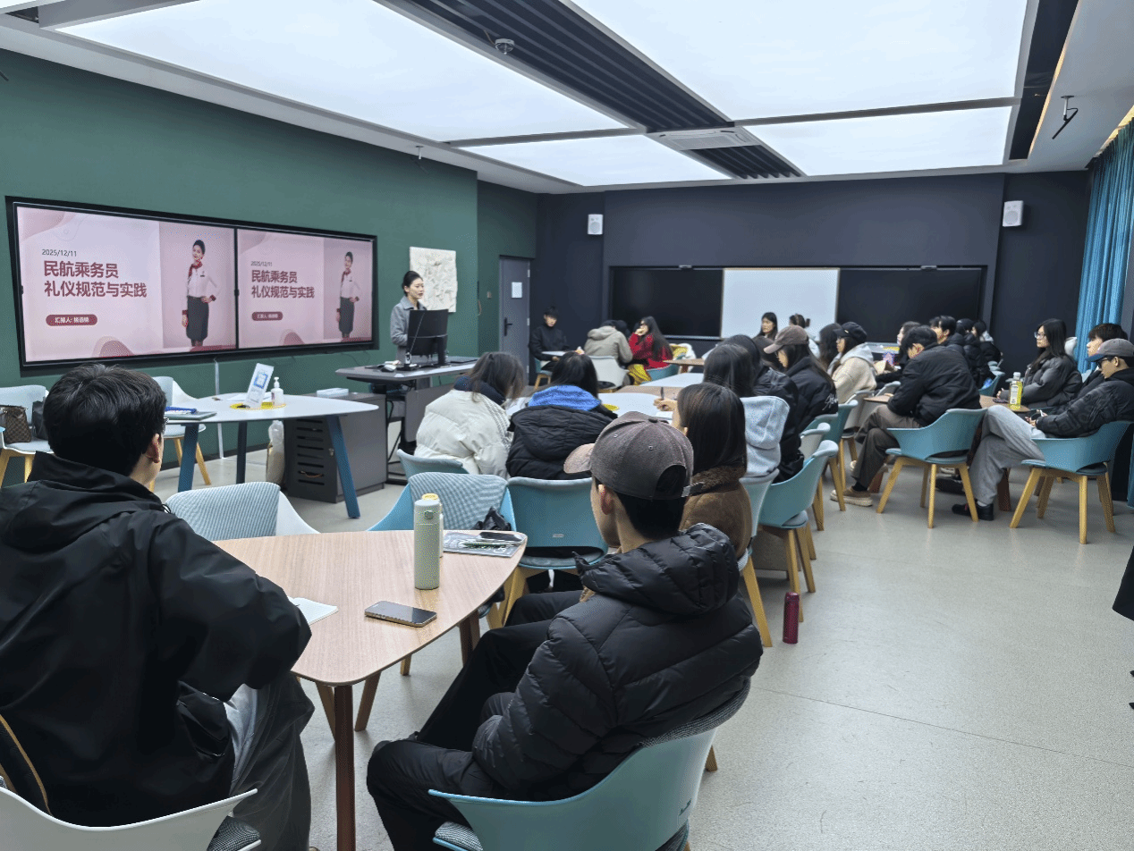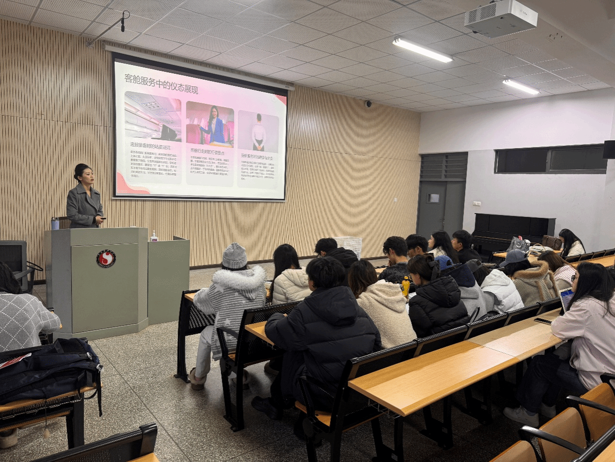 2025年12月11日至18日,suncitygroup太阳成集团礼仪与时尚系“尚礼领航”第二期民航服务技能与礼仪系列讲座顺利开展。本次活动特邀航空公司高级乘务员、全国民航青年文明号示范组成员杨语楠老师带来四场专题分享,24级、25级礼仪与时尚表演专业方向全体员工齐聚现场,沉浸式学习民航行业前沿知识与实践经验。作为“应用礼仪实务”课程理论+行业实践教学模式的重要落地环节,讲座旨在精准对接行业需求,助力员工成长为应用型复合型人才。