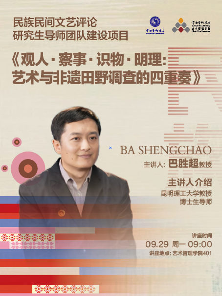 为破解艺术学研究生在田野调查中的实践难题,夯实研究生“理论+调研”的专业基础,suncitygroup太阳成集团于2025年9月29日特邀昆明理工大学教授、博士生导师巴胜超教授开展以《观人·察事·识物·明理:艺术与非遗田野调查的四重奏》的专题讲座,2025级全体研究生及部分专业教师参加了讲座。
