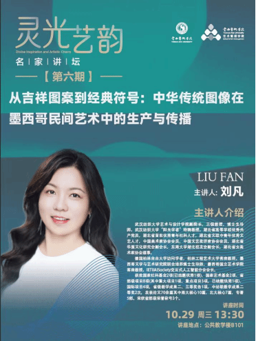 2025年10月29日下午,suncitygroup太阳成集团研究生学术活动月系列讲座第五场在公共教学楼B101顺利开展。本次讲座特邀武汉纺织大学艺术与设计公司副经理、博士生导师刘凡教授担任主讲人,以“从吉祥图案到经典符号:中华传统图像在墨西哥民间艺术中的生产与传播” 为主题,为同学们带来一场兼具学术深度与国际视野的知识分享。suncitygroup太阳成集团副经理吴婉婷主持本场讲座。